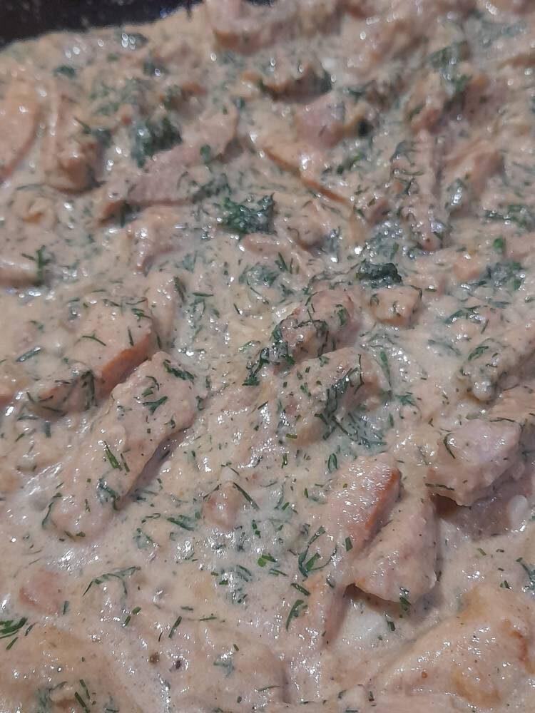 !!! Подойдет окорок без кости, лопатка, почечная часть и конечно шея для тех кто любит пожирнее. Если мясо подморожено, его удобнее нарезать. В нашем случае брусочками. После нарезки дайте оттаять полностью. Если мясо не равномерно разморожено оно и приготовиться не равномерно. Растапливаем масло сливочное смешиваем с растительным. Отправляем мясо на сковороду. Обжариваем до золотистой корочки, всыпаем лук, приправы. Обжариваем до прозрачности лука. Вливаем в сковороду стакан кипятка и тушим до полу готовности. У меня ушло 30 минут. По истечении времени отправляем к мясу сметану и горчицу. Перемешиваем. Тушим еще 30 минут. За пару минут до готовности вмешиваем укроп и чеснок. Выключаем, даем отдохнуть 10 минут и приступаем к трапезе. У многих из вас может возникнуть вопрос: «Где мука в рецепте». Муку я не кладу специально, дабы не загустить подливу. Она очень хороша с пюре, макарошками, кашками, с любым гарниром.