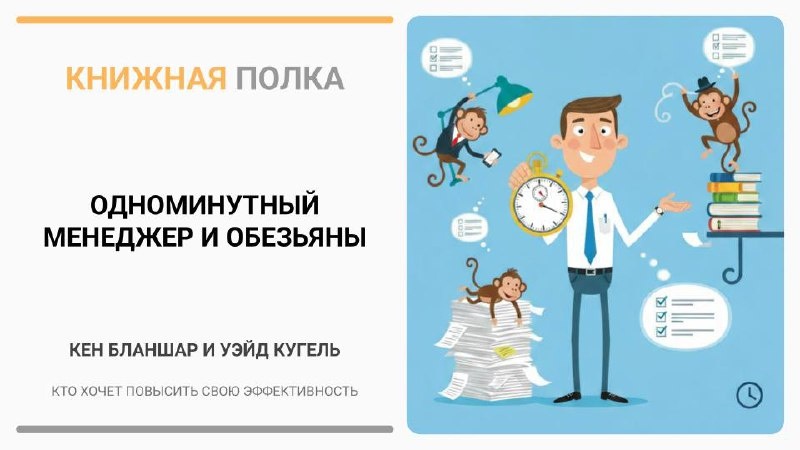 📚 «Одноминутный менеджер и обезьяны» — Кен Бланшар и Уэйд Кугель Эта книга представляет собой практическое руководство по эффективному управлению, направленное на оптимизацию рабочего процесса и улучшение взаимодействия с подчинёнными. Кен Бланшар — известный автор и консультант в области менеджмента, а Уэйд Кугель — опытный специалист по организационному развитию. В соавторстве они исследуют вопросы эффективного делегирования и управления задачами. Книга состоит из ярких метафор и принципов, которые помогают читателю понимать, как управлять временем и людьми. Основные темы включают: - Делегирование задач - Установление целей и ожиданий - Устранение неэффективного контроля Каждая глава посвящена конкретной задаче: авторы объясняют суть подхода, приводят примеры из жизни и предлагают практические советы для внедрения в повседневную практику. Стиль написания лёгкий и доступный, с акцентом на практическое применение. Некоторые из принципов: - "Используйте концепцию одноминутного