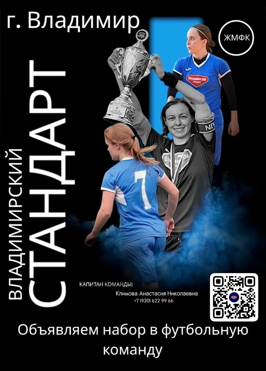 💥Объявляется набор в команду. Женская футбольная команда "Владимирский стандарт" ищет целеустремлённых любительниц футбола, которые хотят развиваться и побеждать. ❓️Хочешь расти и развиваться в футболе? Мечтаешь стать частью одной из лучших команд Владимирской области? Хочешь попробовать свои силы в турнирах разного уровня? Формула простая - приходи к нам! От нас: постоянные бесплатные тренировки и соревнования, бесплатные комплекты игровой формы и море позитива. От тебя: самоотдача и желание. 📌Как попасть на тренировку? Звони (+7-920-622-99-66) или пиши нашему капитану команды Насте. ⚽️Приходи на просмотр и попади в команду!