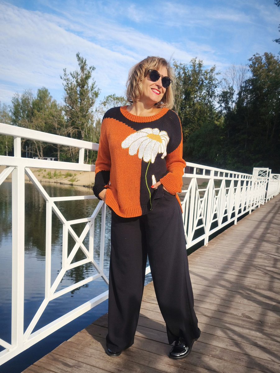 После того, как я связала себе очаровательный, яркий джемпер из качественной пряжи в сочетании льна и микробукле из хлопка, украсив его огромным цветком ромашки, связанной методом интарсии, я испытала истинное удовольствие. Ношу и не нарадуюсь. Но остановиться на одном изделии оказалось непросто, тем более оставалась пряжа такого же артикула, но другого цвета. Решено – свяжу аналогичный джемпер для моей любимой дочери Карины. Представляла, как ей понравится легкий джемпер с ярким рисунком спереди. Тем более скоро собирался поехать к ней в гости, а лучший подарок – это сделанное своими руками и с любовью. Хоть я и понимала возможные риски, поскольку раньше некоторые мои изделия не пришлись ей по душе. Всё дело в размере: я люблю вязать вещи свободного кроя, а дочь привыкла носить одежду, подчеркивающую фигуру. Странно, но моделях оверсайз она чувствует себя не уютно. Новый проект тоже предполагался свободного фасона, так что я без согласования с будущей хозяйкой, взяла на себя о