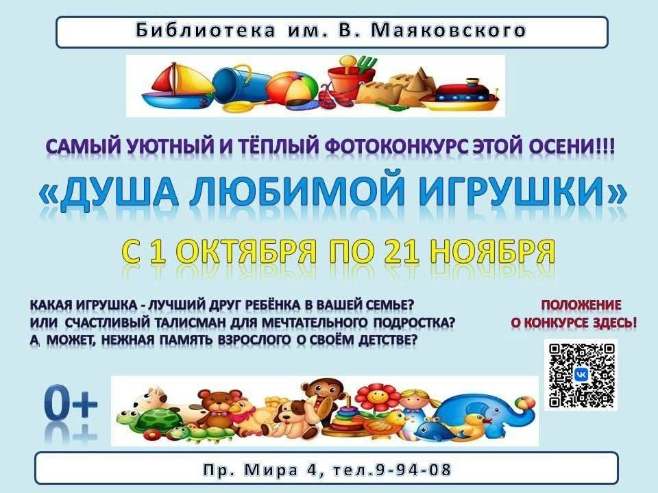 #Конкурс 📸 Отдел семейного чтения приглашает принять участие в ярком фотоконкурсе «Душа любимой игрушки». К участию приглашаются все, кто любит творческие эксперименты, хранит и создаёт семейные воспоминания! 🧸🪆🎏 У каждого из нас была или есть любимые игрушка, для кого-то она стала первым другом, для кого-то счастливым талисманом, а кто-то бережет её, как самое тёплое воспоминание. А у вас или у ваших детей есть такая? Для участия в Конкурсе необходимо: 📍выбрать вашу самую любимую игрушку 📍создать и представить сюжетную или портретную фотографию с игрушкой 📍придумать название, описание или небольшой текст к фотографии 📍каждую работу должна обязательно сопровождать информация об участнике Конкурса (форма для заполнения см. в Положении и конкурсе) Работы принимаются по электронной почте os.bibliotecka@yandex.ru или в отделе семейного чтения библиотеки по адресу пр. Мира, 4 ☎️ 9-94-08 Положение о конкурсе здесь.