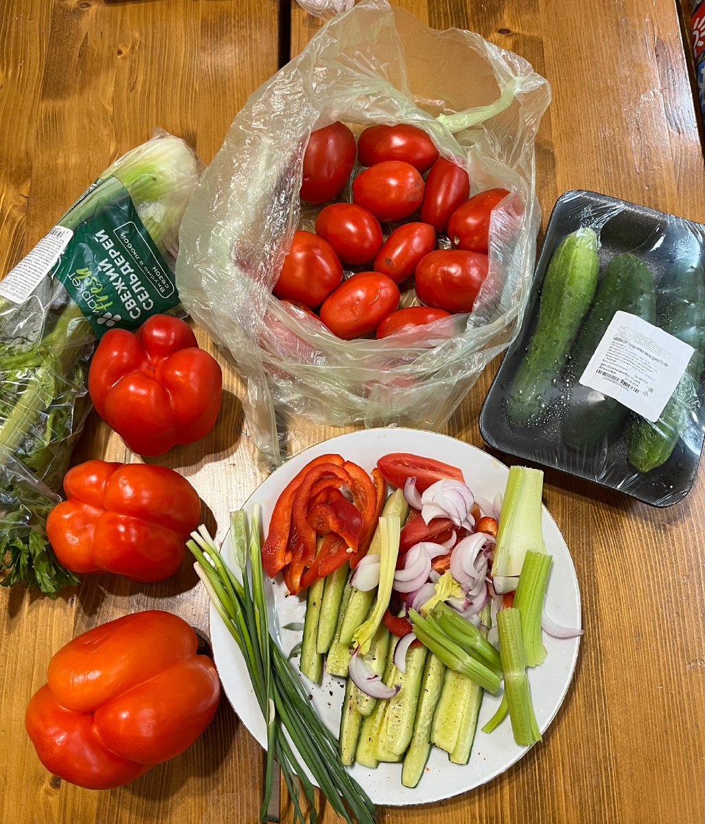 Всем доброго дня! Понедельник. День тяжелый - как принято говорить. Но с утра он мне таким не показался. Все уже было привычно и обыденно. Позавтракала, закинула стирку в машинку, прибрала в бане, сделала ревизию в холодильнике, что там осталось и чем располагаю😊. Овощей осталось достаточно много ( в моем понимании), я столько не съем, могут пропасть. И тут пришла идея- законсервировать все что осталось. Потому как наблюдая в этот приезд, что гости в большем случае налегали на соленые помидоры и огурцы, а к свежим остались более равнодушными, поэтому я решила, что сделаю консервацию. Принцип у меня всегда один- «из того что было»😀 А было- оставалось вот что: Сначала я подумала и решила закрыть небольшую банку с помидорками и перцем, порежу его. Банки здесь у нас уже накопились с закручивающимися крышками, так что машинка закатная не нужна. Сложила в полтора литровую банку помидорки и перчик. И стебли сельдерея добавила. Вообще никогда с ними ничего не консервировала, это экспр