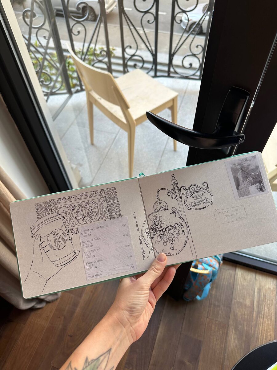 мы уже третий день как в Тбилиси, а я все еще рисую развороты про Баку 😅 и ни капли акварели, зачем я купила скетчбук с акварельно бумагой, другой вопрос, но похоже цвет я буду добавлять уже дома)