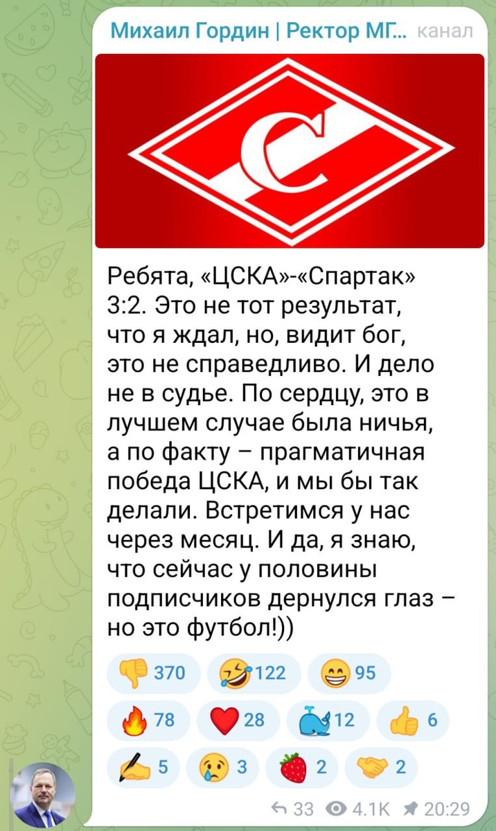 Человек с ником ректора «Бауманки» разразился сленговыми ругательствами на всю Сеть после вчерашнего дерби между ЦСКА и «Спартаком». Как оказалось, интеллигентный 56-летний кандидат технических наук Михаил Гордин — самый настоящий ультрас в душе. Он давно болеет за «Спартак» (и имеет на это право!). Счет 3:2 не в пользу любимой команды вчера заставил его высказаться на футбольном сленге сначала в адрес самого ЦСКА, а затем призвать болельщиков клуба к совершению нелицеприятных действий. Однако Гордин не рассчитывал, что в его «Бауманке» найдется немало фанатов ЦСКА. Они высказали ему, что думают, в его официальном канале. В итоге комментарии там пришлось отключить. ⭕️ Подписаться | Прислать новость | Буст
