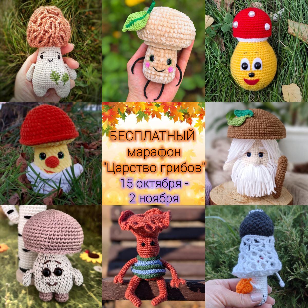 Осень - лучшее время собирать грибы! Мы приглашаем создать замечательную коллекцию съедобных и несъедобных грибов. На нашем марафоне вы свяжете 8 игрушек: 1. Лисичка 2. Мухомор 3. Шампиньон 4. Подберезовик 5. Цезарский гриб 6. Боровик 7. Сетконоска 8. Сморчок 🍁 Марафон БЕСПЛАТНЫЙ! 🍁 Старт марафона: 15 октября. 🍁 Подведение итогов: 31 октября - 02 ноября. 🍁 Присоединиться можно на любом этапе до 29 октября. 🎁 По завершению марафона вас ждут подарки от наших спонсоров! 🎁 Условия и правила участия здесь 👉https://vk.com/topic-222823357_55138006