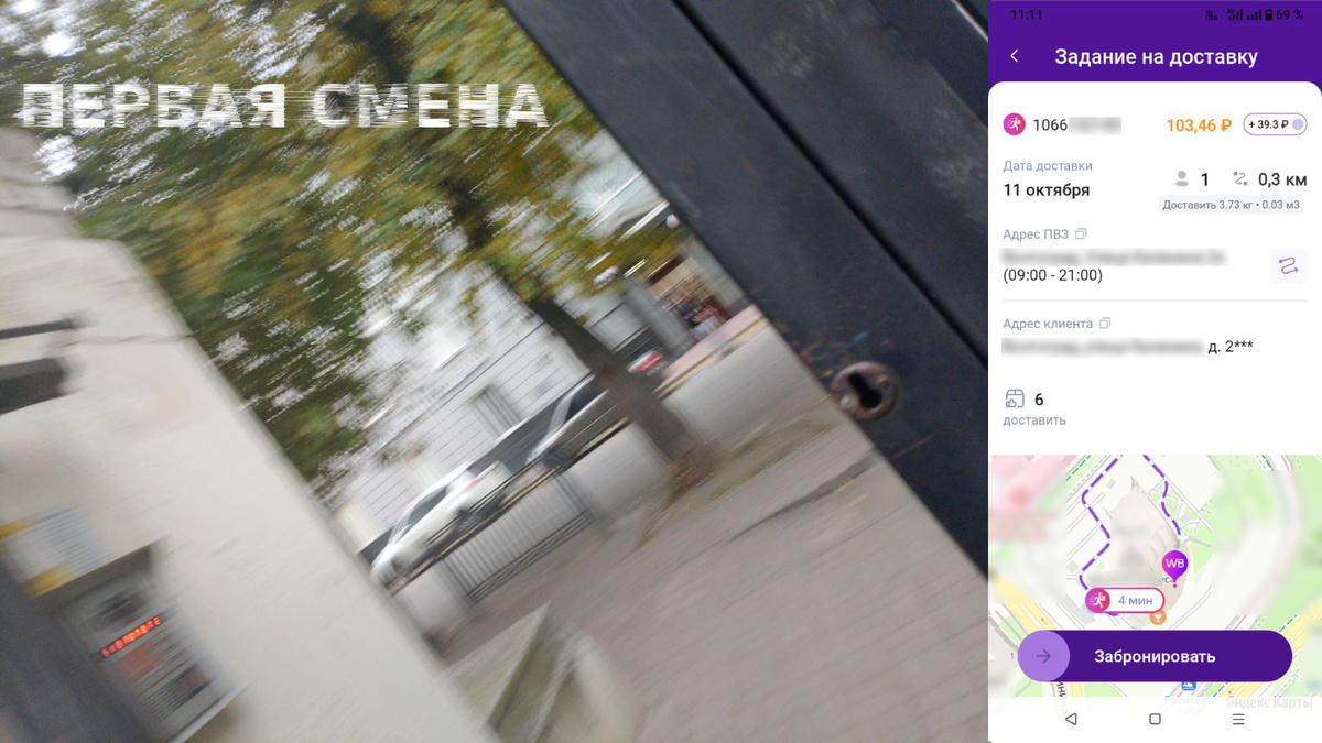 Подхожу к ближайшему ПВЗ. Бронирую задание на доставку в соседний подъезд многоквартирного дома (МДК). На 1 этапе курьер видит только адрес ПВЗ, частичный адрес клиента, желаемое время доставки. Вес заказа и количество товаров в нём.