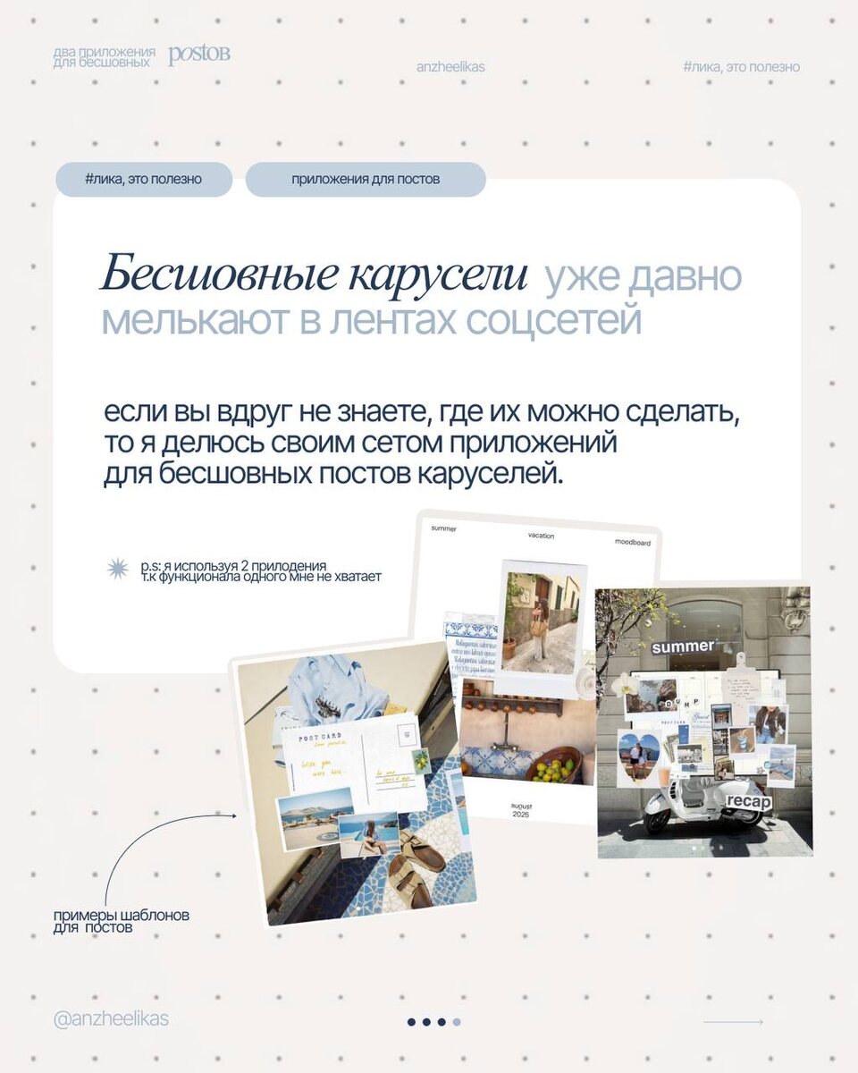 Два приложения для бесшовных каруселейм (связка, которой пользуюсь я) Где собираю карусели 17v28 — мой базовый конструктор. В нем куча готовых шаблонов для постов и сторис, но я чаще верстаю с нуля. ➕Плюсы: • Один бесшовный пост — до 20 слайдов. Удобно для длинных историй. • Встроенные стикеры, рамки, нарисованные элементы, плюс можно рисовать свои. ⚡️Новое и важное: добавили видео. Для меня это апгрейд, ради которого подписка за 329 рублей наконец-то имеет смысл. • Можно загружать свои шрифты. ➖Минус: нельзя тонко настраивать кернинг и интерлиньяж (расстояние между буквами и строками). Чем докручиваю Bazaart — мой помощник по типографике и вырезкам. • Импорт своих шрифтов + точная настройка расстояния между строками и буквами, деформация и изгиб текста — то, чего не хватает в 17v28. • Быстрое удаление фона из фото. Любое изображение превращаю в стикер и собираю коллажи за минуты. 😋Почему именно такая связка: 17v28 — закрывает структуру и дизайн-систему карусели. Bazaart