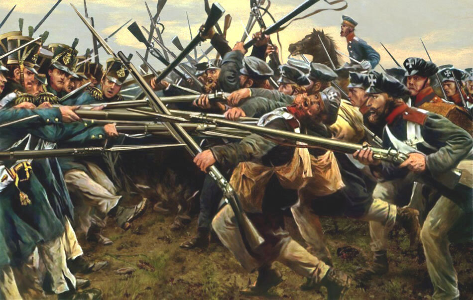 · XVIII — начало XIX века: В эпоху гладкоствольного дульнозарядного оружия с низкой скорострельностью и меткостью штыковая атака часто была решающим элементом боя. Общая длина ружья со штыком рассчитывалась так, чтобы пехотинец мог противостоять кавалеристу . Штыковой бой был массовым и решительным.