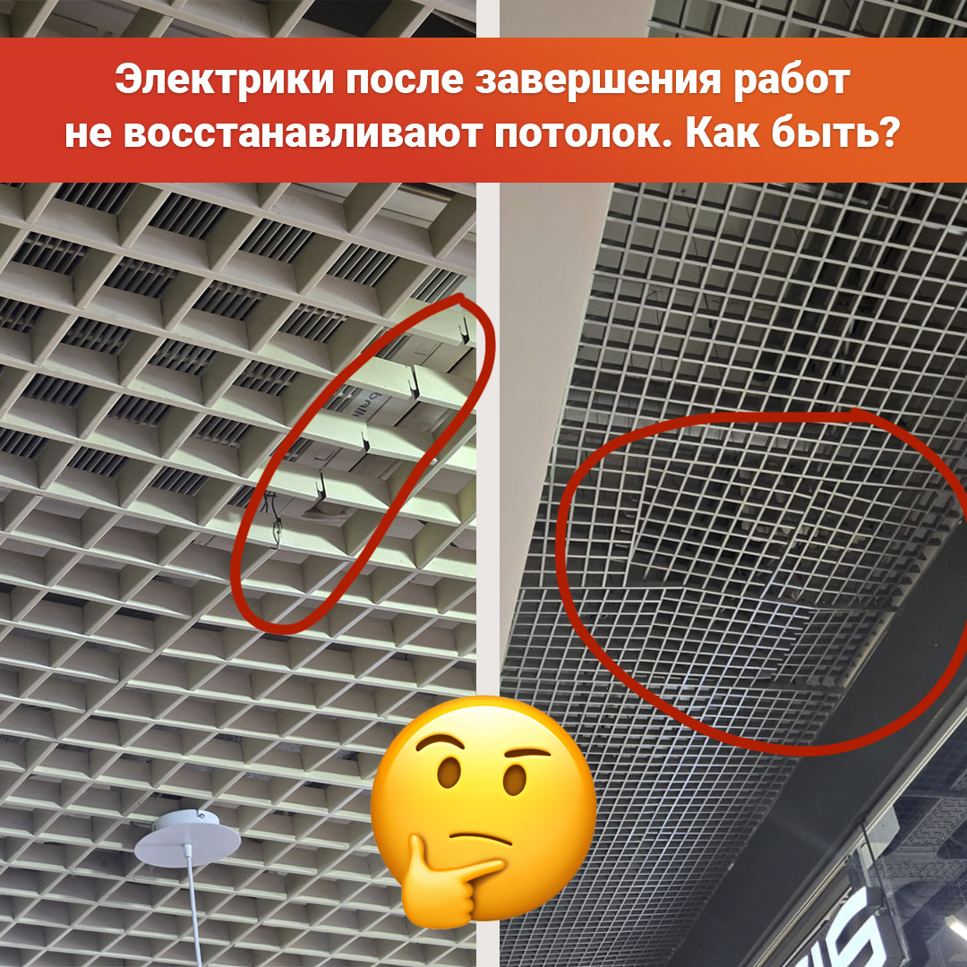 🏣В торговых центрах часто наблюдается такая ситуация: электрики после завершения работ не возвращают на место кассеты грильято 🤦♂. Потолок в результате теряет свою целостность и выглядит менее привлекательно. Может торговым центрам сотрудничать с монтажными бригадами, специализирующимися на установке и обслуживании подвесных потолков? Такой подход обеспечит оперативное и качественное восстановление потолочных систем после проведения ремонтных или технических работ.