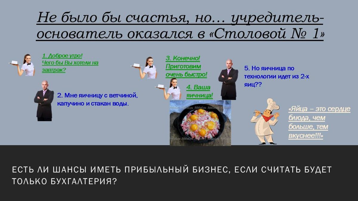 В первой и второй сериях собственник Столовой пытался обязать бухгалтерию посчитать себестоимость, рентабельность и прибыль самостоятельно, не трогая при этом производителя работ, т.е. повара.