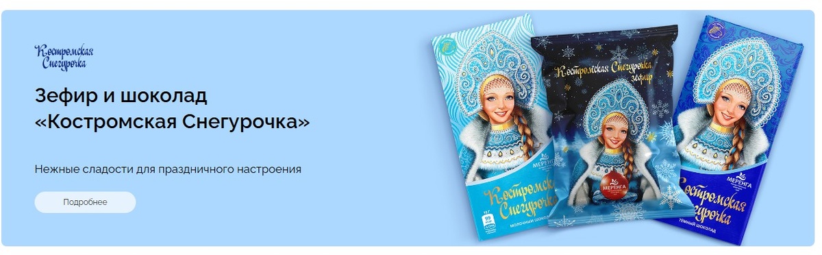 Бренд «Меренга» покоряет зарубежные рынки и превращает Костромскую Снегурочку в сладкий символ страны Российский экспортный центр представил компании, которые успешно продвигают отечественные бренды за рубежом под знаком качества «Сделано в России». Среди них оказалась и костромская кондитерская фабрика «Меренга» (ООО «Карамелия»), основанная еще в 1946 году и ставшая одним из самых узнаваемых производителей сладостей в стране. Подробности сообщает РИА Новости. Сегодня на фабрике делают более 150 видов продукции — от зефира и пряников до пастилы и шоколада. Особой гордостью производства является бренд «Костромская Снегурочка». «Это не просто сладость — это часть русской сказочной традиции, которая полюбилась и в России, и далеко за ее пределами», — отмечают в РЭЦ. Экспорт компания начала в 2016 году с поставок в Беларусь и Казахстан. Сейчас география шире: Грузия, Молдавия, Азербайджан, активное развитие продаж в Китае. «В Китае востребованы классические плитки без начинки, но растет с