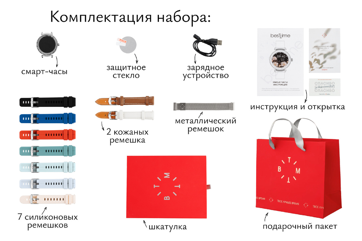 Уникальные смарт часы с 10 ремешками — умный помощник и стильный подарок в одном наборе. Время - самый ценный ресурс. Именно с этой идеи началась история бренда BT OFFICIAL STORE. Сегодня мы являемся ведущими производителями смарт часов, которые станут для вас не только надежными партнерами в работе, спорте, путешествиях и отдыхе, но и стильными аксессуарами, которые легко дополнят любой гардероб, стиль и случай жизни. Мы смогли воплотить в жизнь самое главное желание каждой девушки Смарт часы, которые будут сочетаться с любой вещью в гардеробе. 10 ремешков в наборе — это готовое решение на каждый день! Каждый набор доставляется в подарочной упаковке и шкатулке, в которой вы можете хранить не только часы, но и ваши любимые украшения. Дополнительно в комплектацию к каждому набору идут зарядное устройство, защитное стекло, инструкция и открытка. Наши часы проходят тщательный контроль на всех стадиях производства, что позволяет гарантировать их безупречное качество. В подтвержд
