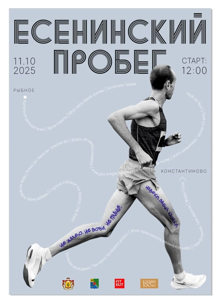 ⚡️ Мероприятия в честь 130-летия Сергея Есенина продолжаются! 11 октября в Рыбном состоится фестиваль бега «Есенинский пробег». В нём примут участие около 2000 спортсменов со всей страны! Маршрут полумарафона будет пролегать по автодороге от Рыбного до села Константиново — более 20 км! Торжественное открытие — в 11:45 на площади Ленина. Старт основного забега — в 12:00 ⏰ Также планируются детские забеги: 1 км для детей до 2016 года рождения включительно и 2,5 км — для детей 2012-2015 годов рождения. ❗️ Обратите внимание, что на время основного забега будет перекрыта дорога Рыбное — Константиново! Открывать её будут по мере прохождения дистанции участниками. #гуляка_интересное 🤩 Рязанский гуляка