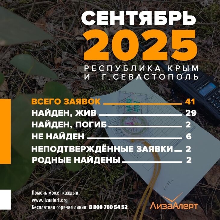 За сентябрь в Крыму нашли мертвыми двоих пропавших человек. Поиски еще шести крымчан продолжаются. Живыми нашли 29 человек. Об этом сообщили в поисковом отряде «Лиза Алерт» Крым. ЧИТАЙТЕ ТАКЖЕ: В Крыму уже неделю ищут высокого мужчину «В сентябре в отряд поступила 41 заявка на поиск пропавших людей по всей Республике Крым и г. Севастополь. Из них найдены живыми — 29, найдены погибшими — 2, найдены родные — 2, не найдены — 6, неподтверждённые заявки — 2», - говорится в сообщении. Читайте новости Крыма первыми в нашем Telegram-канале и даже когда не работает мобильный интернет в национальном мессенджере MAX.