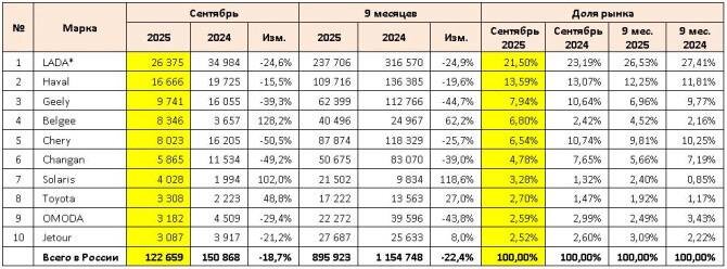 Статистика российского рынка в сентябре Агентство Автостат сообщает, что в сентябре 2025 года в России продали 122 659 новых автомобилей. Это лучший показатель с начала года. При этом отставание от показателей 2024 года составило 18.7%. Самые продаваемые марки в России: • Lada – 26 375 единиц • Haval – 16 666 единиц • Geely – 9741 единица • Belgee – 8346 единиц • Chery – 8023 единицы • Changan – 5865 единиц • Solaris – 4028 единиц • Toyota – 3308 единиц • Omoda – 3182 единицы • Jetour – 3087 единиц Автомобили китайской марки Chery уступили в рейтинге белорусскому бренду Belgee. Во многом это связано с замещением моделей Chery теми же машинами, но под маркой Tenet. Примечательно, что в топ-10 второй месяц подряд входит Toyota, хотя автомобили японской марки не продают в России официально с 2022 года. Самые продаваемые модели в России: • Lada Granta – 11 931 единица • Haval Jolion – 6154 единицы • Lada Vesta – 5997 единиц • Belgee X50 – 5547 единиц • Geely Monjaro – 4043 единицы •