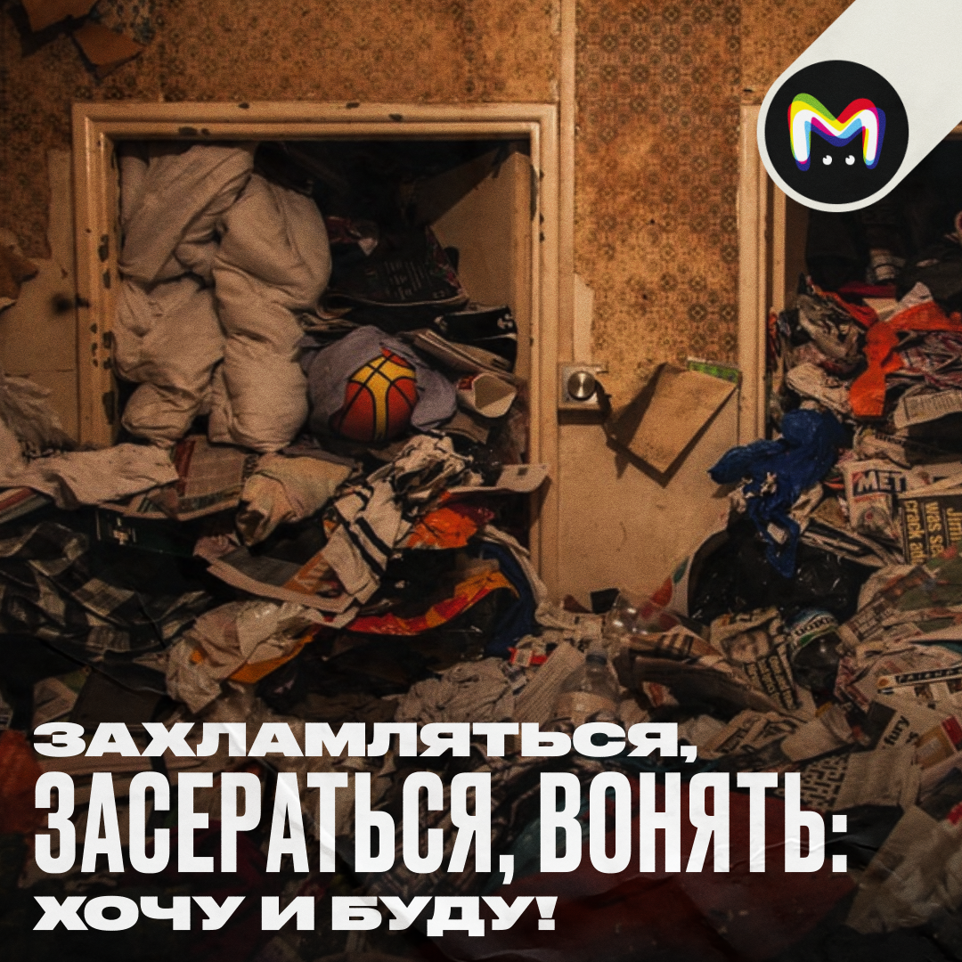 Когда жилище превращается в полигон ТБО. Пройти между залежами становится сложно или даже невозможно. В квартире появляется живность — мелкая и покрупнее, и это далеко не домашние хвостики. Стены покрываются плесенью, а смрадные миазмы выходят за пределы квартиры и бьют в нос соседям.
