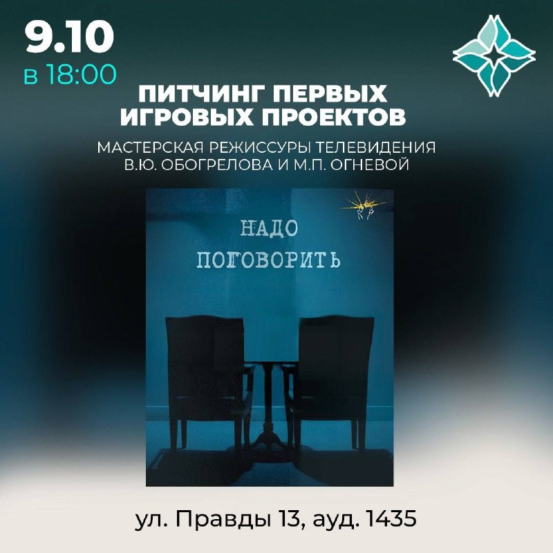 Надо поговорить 🗣️ Мастерская режиссуры телевидения Валерия Обогрелова и Марины Огневой приглашает вас на питчинг первых игровых проектов! 📅 9 октября, в 18:00 📍 ул. Правды, 13, ауд. 1435