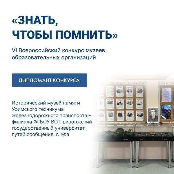 Исторический музей памяти Уфимского техникума железнодорожного транспорта филиала Приволжского государственного университета путей сообщения стал дипломантом Всероссийского конкурса музеев «Знать, чтобы помнить». Конкурс проводился «Единой Россией» в рамках партийного проекта «Историческая память». На шестой конкурс музеев образовательных организаций «Знать, чтобы помнить» поступило более 2,3 тысяч заявок их 82 регионов, из них 44 заявки от музеев вузов. В финал конкурса вышли 169 музеев. В номинациях «Лучший городской музей» и «Лучший сельский музей» стали 92 из них, они получат на развитие музейной деятельности от 200 до 500 тысяч рублей. По словам координатора партпроекта «Историческая память», руководителя Центрального исполкома партии Александра Сидякина, экспонаты, переданные в музеи родственниками школьников, имеют большое значение для формирования глубокого понимания истории своей семьи, страны и укрепления патриотизма. С… https://uchaly102.ru/?p=103993