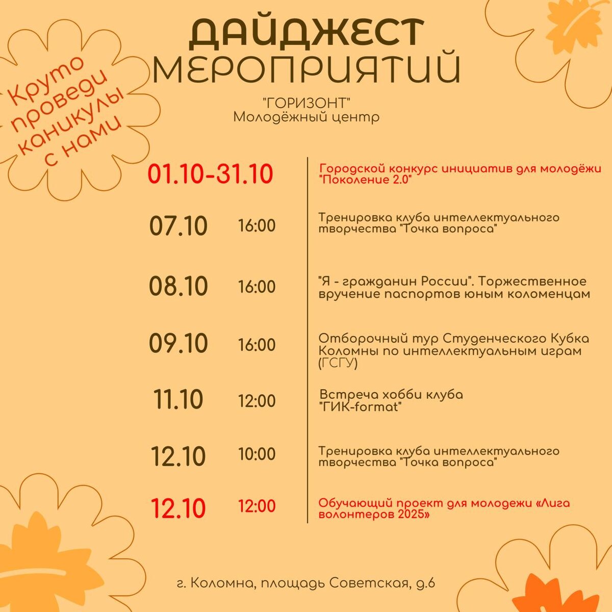 Урааааа, КАНИКУЛЫ🥳🥳🥳 Приходи в Молодёжный центр "Горизонт" классно проводить время 😏 Куда? - г. Коломна, пл. Советская, д. 6 (тел. для связи: 8(496)612-57-55) #МЦГоризонт #МолодежьКоломны #ВсехЖдем #АфишаМЦГоризонт #РДДМ #Афиша