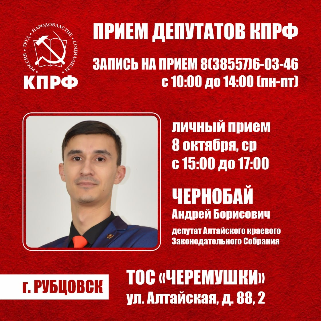 ⚡️Приемные дни депутатов Алтайского краевого Законодательного Собрания по адресу: г. Рубцовск, ул. Алтайская, д. 88, 2 тел. 8(38557)6-03-46 📌8 октября, ср, с 15:00 до 17:00 ЧЕРНОБАЙ Андрей Борисович депутат Алтайского краевого Законодательного Собрания