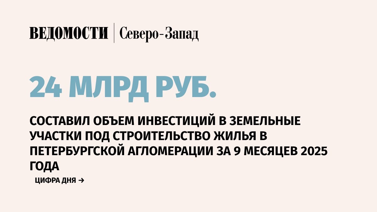 Объем инвестиций в земельные участки под строительство жилья в Петербургской агломерации за девять месяцев 2025 г. составил 24 млрд руб., следует из данных NF Group. Ранее в компании сообщали, что по итогам трех кварталов 2024 г. девелоперы инвестировали в покупку земельных участков в агломерации более 60 млрд руб. Таким образом, объем инвестиций сократился на 60%. ➡️Всего за три квартала текущего года девелоперы приобрели 182 га земли. Реализация проектов может пополнить рынок жилой недвижимости Петербурга и Ленобласти почти на 1 млн кв. м. ⚪️По данным консалтеров, крупнейшей по стоимости в 2025 г. остается сделка I квартала по приобретению девелопером Fizika Development земельного участка площадью 4,7 га на Матисовом острове у «Группы ЛСР». Сумма сделки оценивается в 7–8 млрд руб. ⚪️Вторая по стоимости сделка 2025 г. – приобретение ГК «ПСК» участка площадью 3 га на Васильевском острове у ГК «Самолет», она оценивается в 6–7 млрд руб. Оба участка переданы с действующим разрешением н