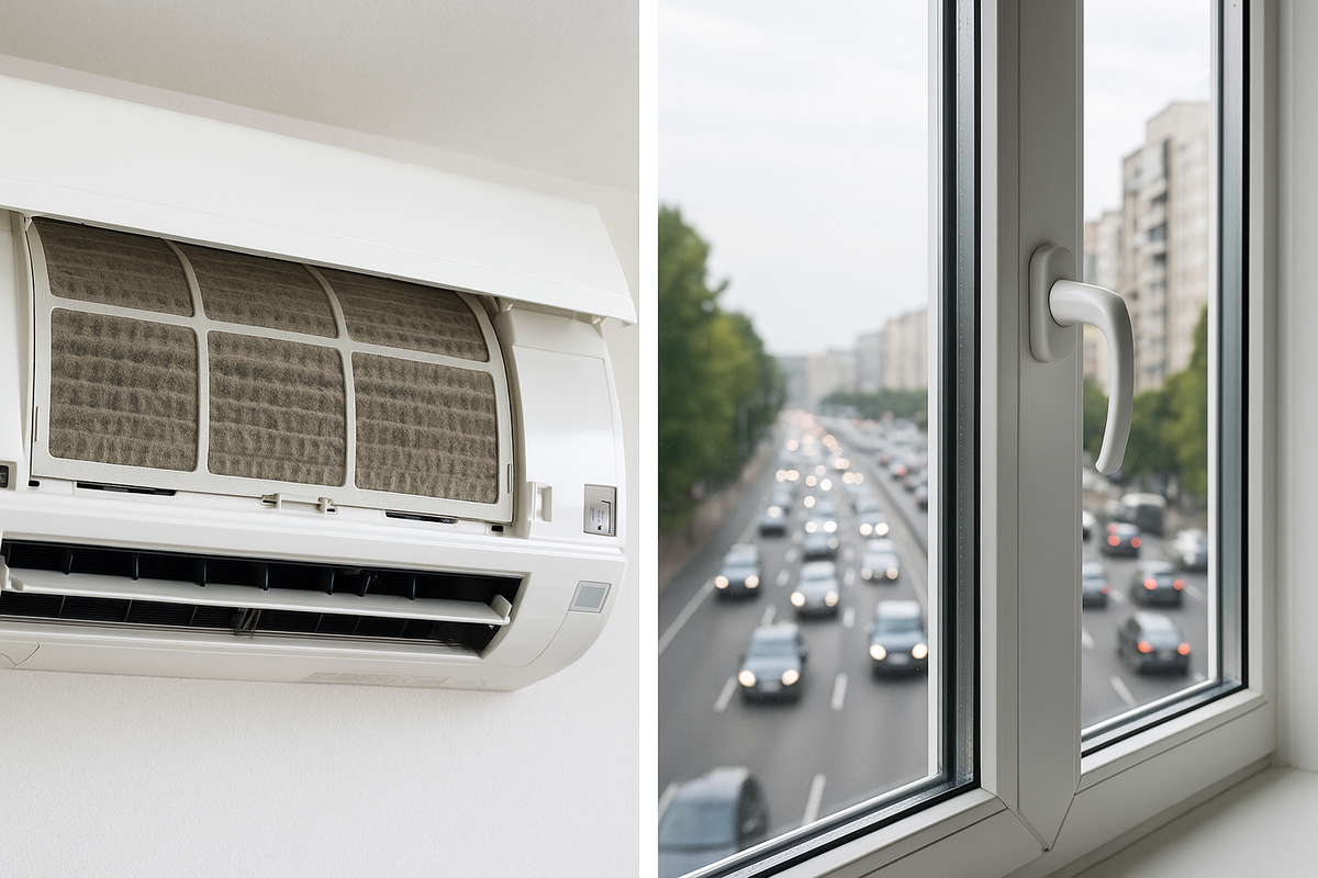 Если его не мыть: 👉 Учёные называют такой эффект «синдромом больного дома». 📌 Уже через 2–3 месяца без чистки кондиционер превращается в настоящий рассадник бактерий. Кажется, что открытое окно — это свежий воздух. Но если за окном оживлённая трасса, то вместе с прохладой в квартиру попадает: 👉 ВОЗ приравнивает постоянное дыхание у дороги к курению нескольких сигарет в день. То есть, окно у оживлённой трассы опаснее в долгосрочной перспективе, но кондиционер без фильтра способен вызвать серьёзные проблемы уже через несколько дней. Кондиционер без фильтра и открытое окно у дороги — два разных источника загрязнения. Первый опасен внутри квартиры, второй приносит внешние токсины.