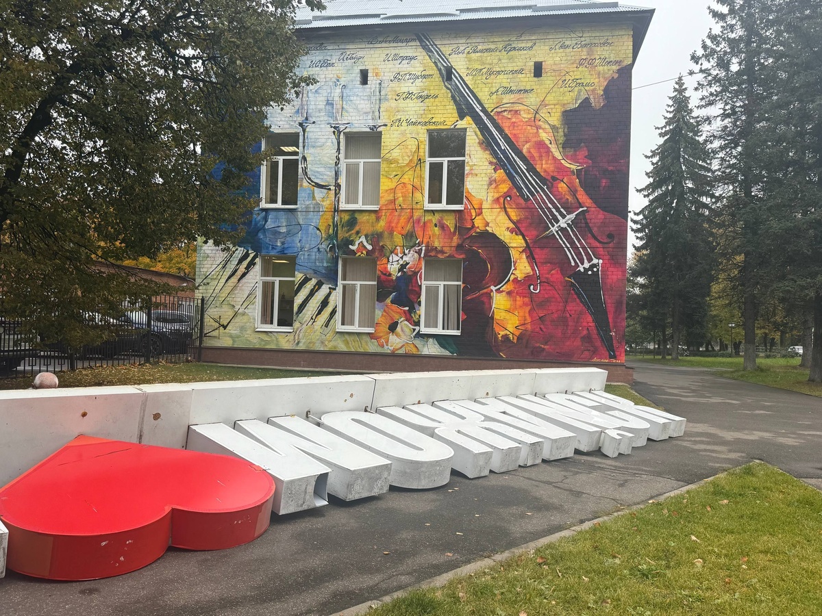 Надпись «Я люблю Можайск» на боку. Но ненадолго. Видно, что ее ремонтируют или решили обновить. Специалисты работают, исправляют подсветку букв, скоро сможем оценить результат!