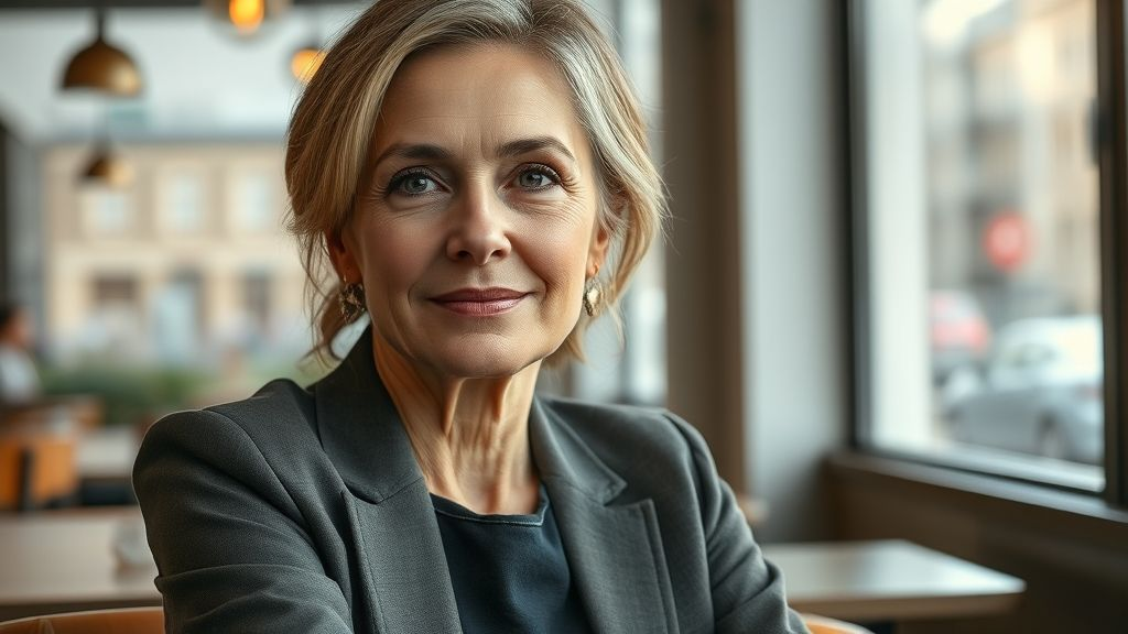 A photorealistic portrait of a resilient Russian woman in her late 30s with calm, determined eyes and a slight knowing smile, sitting in a bright modern cafe near a window with natural daylight, wearing elegant casual clothes, background softly blurred showing urban Russian setting, sense of inner strength and new beginnings, warm natural lighting, professional photography style, realistic details and textures, confident and peaceful expression