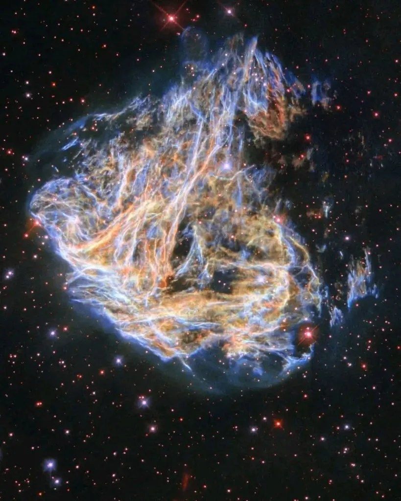 Космический телескоп «Хаббл» получил это изображение остатка сверхновой DEM L 190 (также LMC N49), самой яркой звезды в Большом Магеллановом Облаке, расположенном примерно в 160 000 световых лет от нас в созвездии Золотой Рыбы. Тонкие волокна остатка представляют собой продукты взрыва, из которых впоследствии образуются новые звезды. Он взаимодействует с межзвёздной средой и содержит магнетар — быстро вращающуюся нейтронную звезду, испускающую мягкое гамма- и рентгеновское излучение.