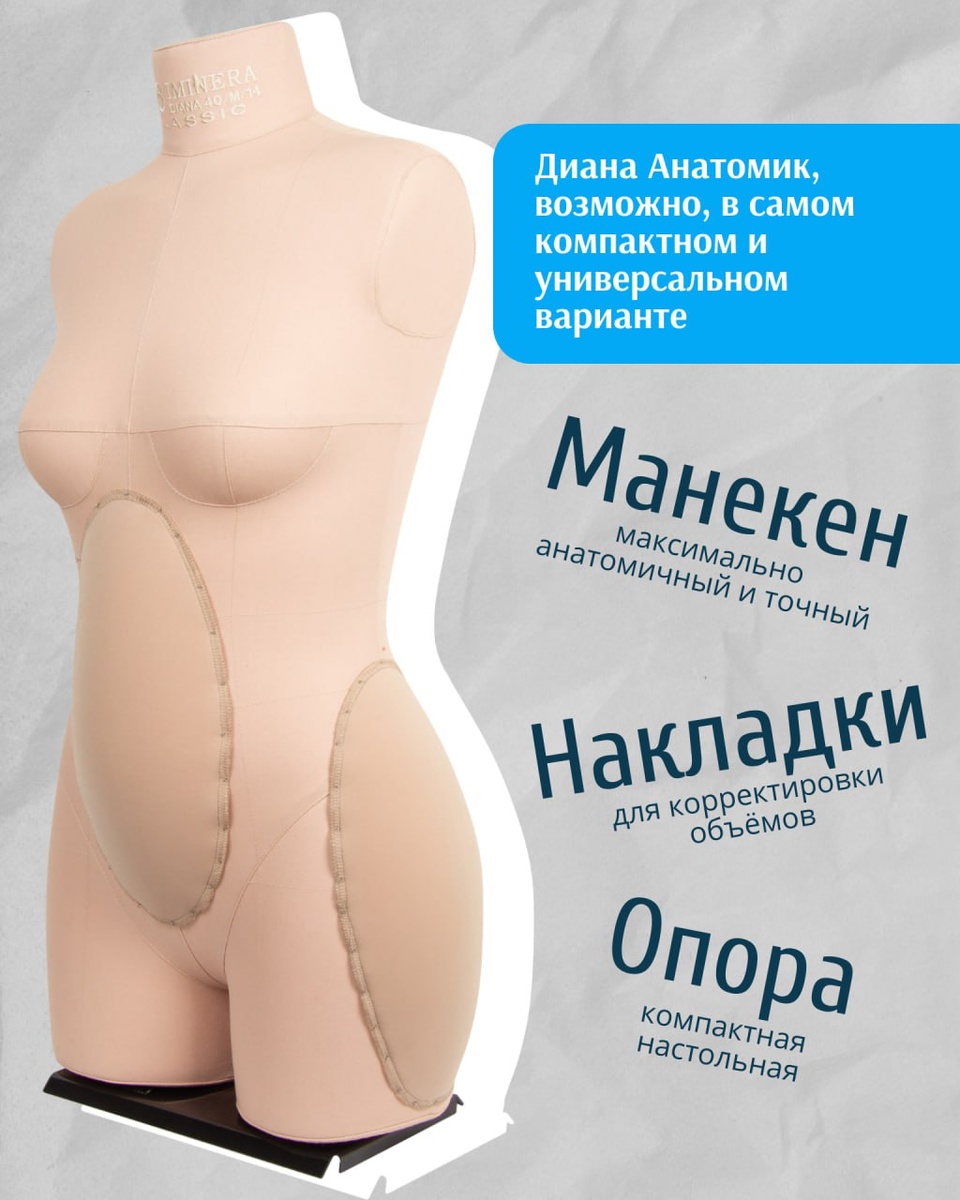 На фото — манекен Diana Anatomic с настольной опорой и накладками для корректировки обхватов. Это, пожалуй, самый удобный и универсальный комплект для учёбы, ателье и домашних мастерских.