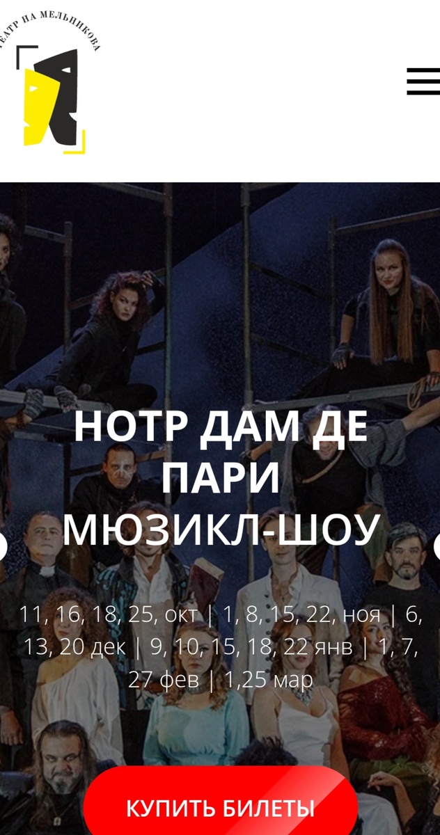 По мотивам романа Виктора Гюго "Собор Парижской Богоматери" Режиссёр - Илья Быков Французско-канадский мюзикл "Нотр-Дам де Пари " - шедевр мировой музыки. Начав своё триумфальное шествие в Париже в 1998 году, мировой хит стал легендарной театральной постановкой и в Москве. Арии из мюзикла давно стали популярными шлягерами и завоевали сердца меломанов. Нынешняя постановка режиссёра Ильи Быкова в театре на Мельникова предлагает современную интерпретацию романтической драмы об одержимости, страсти и любви. Величественный собор Нотр-Дам де Пари присутствует на сцене в минималистичных декорациях. Их подвижные конструкции и игра светотеней воссоздают готические арки собора, улицы Парижа и Двор чудес. Передать драму посредством музыки и хореографии - задача не из легких. Поэтому сильные вокалисты заняты во всех мужских ролях. Прекрасный певец и актёр с импозантной внешностью Максим Клестов исполняет роль Пьера Гренгуара - поэта, драматурга, который убеждён, что рок судьбы возможно прео