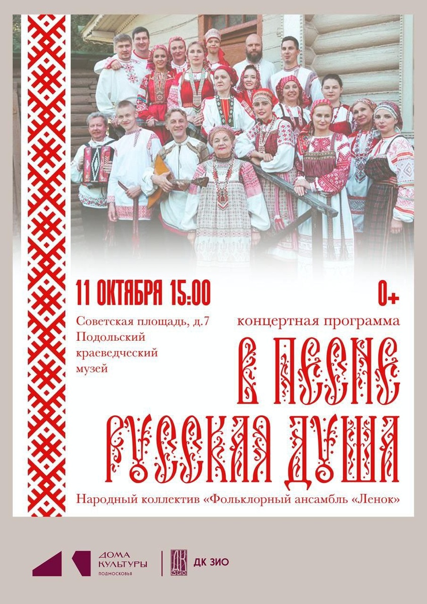 ✨ Концертная программа "В песне русская душа" Выступит Народный коллектив "Фольклорный ансамбль "Ленок"🌾 📆 11.10.2025 🕒 15:00 🏢 Подольский краеведческий музей 📍 г. Подольск, Советская площадь, д.7 💰 Вход свободный❗️ ⭐Поддержать канал голосом 💰 Вакансия - курьер в Подольске ✅ Мероприятия Подольск https://dzen.ru/id/66ed500f7b5671493eca3fd6 http://vk.com/podolsk_events http://dzen.ru/podolsk_events