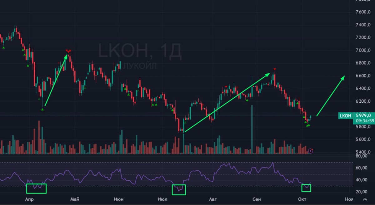 ⛽️ #Лукойл #LKOH #bogdanoffinvest 🟢 Еще 30го сентября во фьючерсе на Лукойл пролетел чей-то МК, об этом я писал тут. Это было финалом для какого-то крупного игрока. С тех пор рынок еще скатывался вниз без новостей. 🟢Что сейчас? Никакие шипы по фьючу мы не пошли отрабатывать. За весь 2025 год на графике было всего два случая перепроданности на дневном тайм-фрейме. Оба раза приводили к существенному росту. 🚗 Посмотрим, как будет себя вести график на этой перепроданности. Пока что нисходящие линии здесь не пробиты. По мере подхода к ним, будем отслеживать динамику процесса.