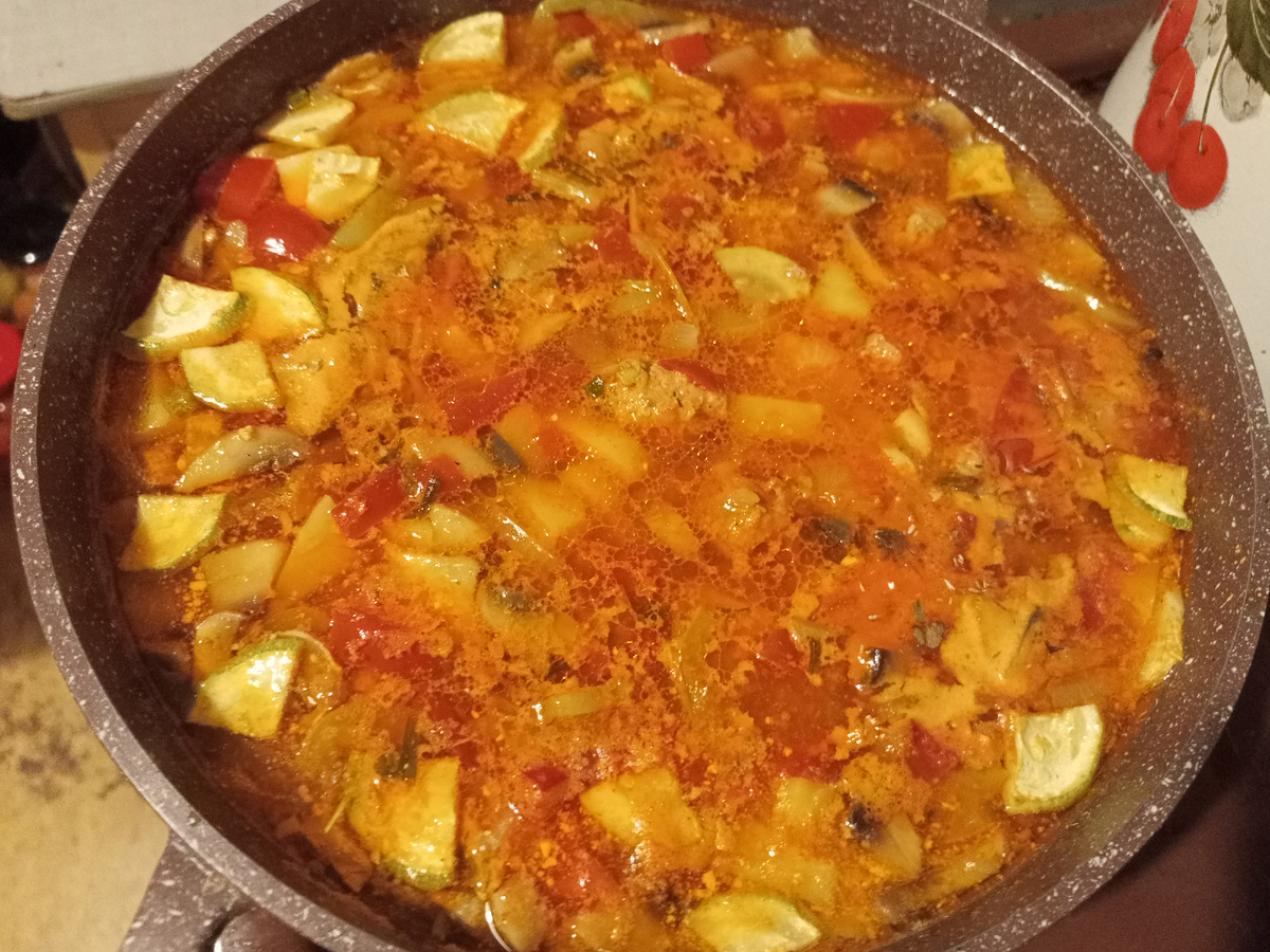 Ингредиенты: Фарш Бульон из рецепта фаршированного перца в казане Лук репчатый Помидоры Кабачок Лавровый лист Болгарский перец Соль Перец чёрный горошком Картошка Чеснок Хмеле-сунели Способ приготовления: Итак, мы готовили фаршированный перец Вот этот рецепт: У нас остался фарш, если мы захотели приготовить и это блюдо тоже. Берём казан, и переливаем бульон из казана с фаршированным перцем. Ну примерно понадобиться половина бульона из казана с перцем. Ну если у вас нет невысокого казанчика, берите сотейник или с высоким бортом сковородку, или жаровню. Воду добавлять не будем, будем готовить только на бульоне из под перца. У нас есть фарш, но мы его дополним немного. Возьмем один помидор и луковицу репчатого лука, среднего размера. Режем их на кружки, потом каждый кружок делаем на полоски и нарезаем квадратиками. Добавляем к фаршу. Возьмите половину среднего кабачка и натрите его на терке, добавьте в фарш. Теперь очень хорошо перемешайте весь фарш. Включаем огонь с бульоном в каз
