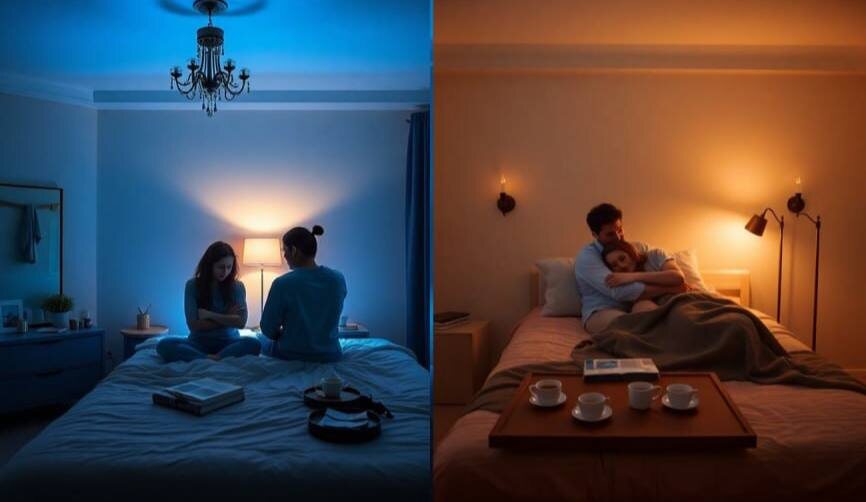 Холодный белый свет в спальне вызывает раздражение. Теплый — создает гармонию.Спасите свою семью с помощью света!👉 [Выбрать теплые лампы]