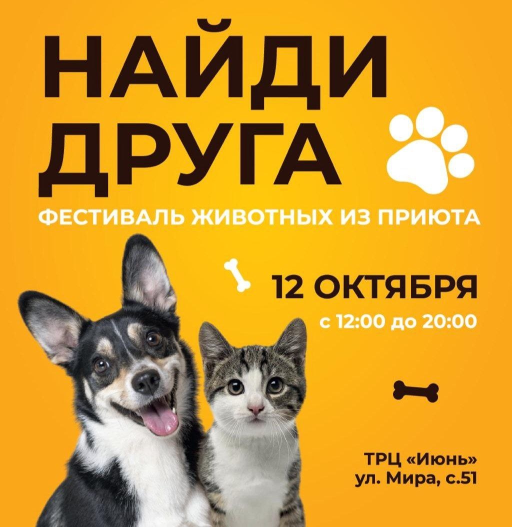 Фестиваль животных из приютов «Найди друга» состоится в ТРЦ «Июнь», Мытищи! 12 октября с 12:00 до 20:00 на 1 этаже вас будут ждать самые ласковые и добрые кошки и собаки, которые ищут свой дом. Все питомцы здоровы, привиты и готовы стать частью вашей семьи.