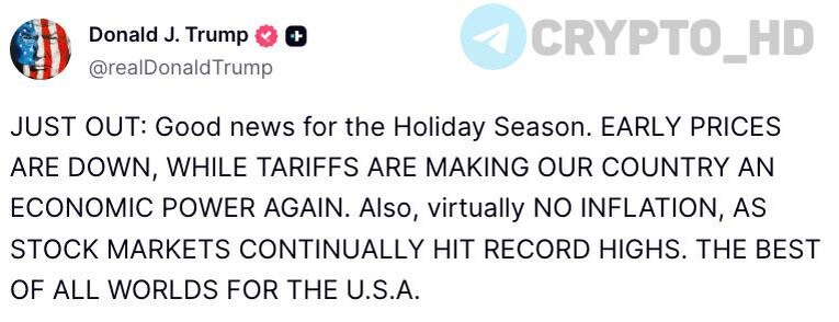 🇺🇸 Дональд Трамп: Отличные новости к праздничному сезону – цены на товары снижаются, пошлины снова делают нашу страну экономической сверхдержавой. В США практически НЕТ инфляции, а фондовый рынок продолжает бить рекорды. Лучшие из всех возможных условий для США. Crypto Headlines
