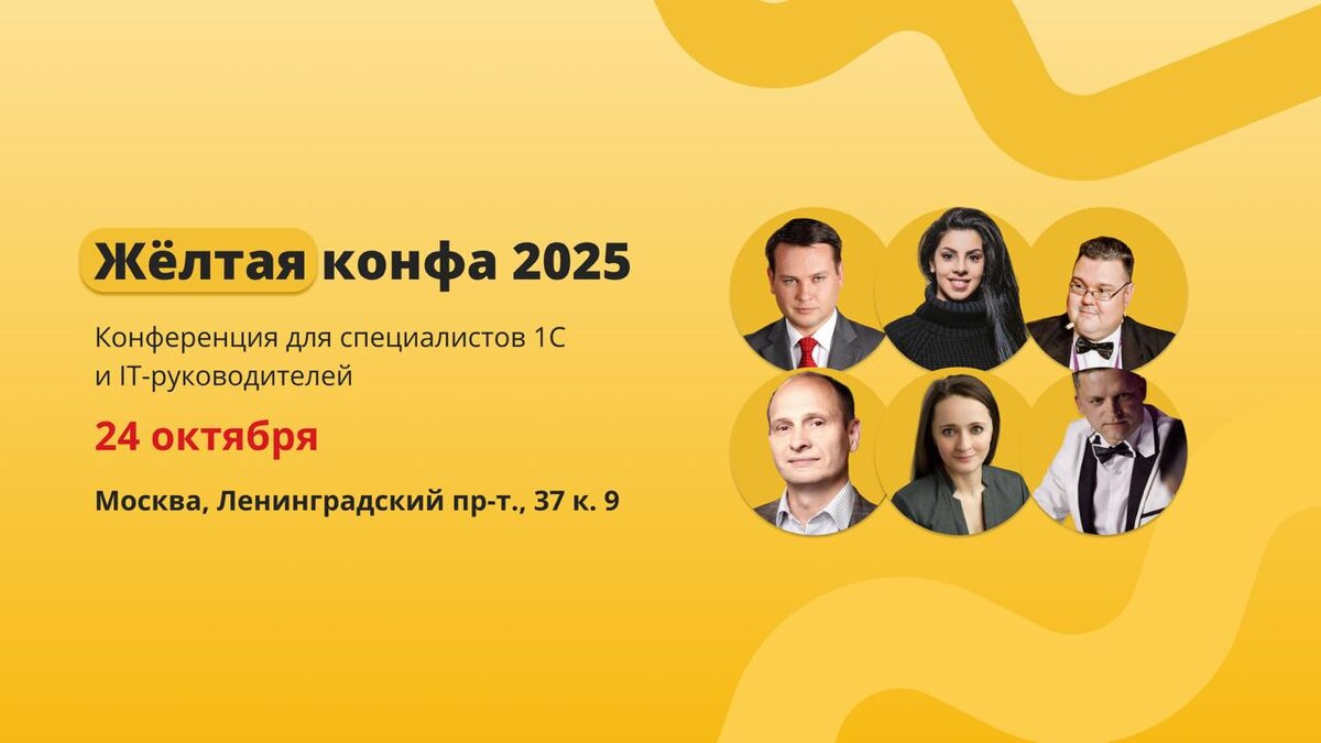 ⚡️24 октября в Москве «Жёлтая конфа» — событие для специалистов 1С и IT-руководителей. Соберутся более 300 специалистов: аналитики, программисты, архитекторы, руководители проектов. День будет плотный: доклады, дискуссии, практика и много живого общения. Что вас ждёт: ◦ 25 экспертных докладов от специалистов 1С, Ozon, MAKER-STUDIO, Ingvar Consulting и других ◦ 3 секции: аналитика, разработка, управление ◦ Спецгость — Глеб Архангельский с темой «Тайм-менеджмент в эпоху ИИ» ◦ Нетворкинг, обед и кофе-брейки для знакомств ◦ Викторина с ценными призами ◦ Для VIP — ужин со спикерами В программе: — Цифровой офис будущего: интеграция удалёнки, безопасности и автоматизации процессов — BI-аналитика за пределами 1С. Привычные паттерны, ошибки и тенденции — 7 ошибок в структуре проектов 1С:ERP и как не утонуть при внедрении — Коучинговые инструменты руководителя — Взгляд в будущее с ИИ — И ещё более 20 тем для развития и прокачки в профессии Зарядитесь свежими идеями от практиков, найдёте по