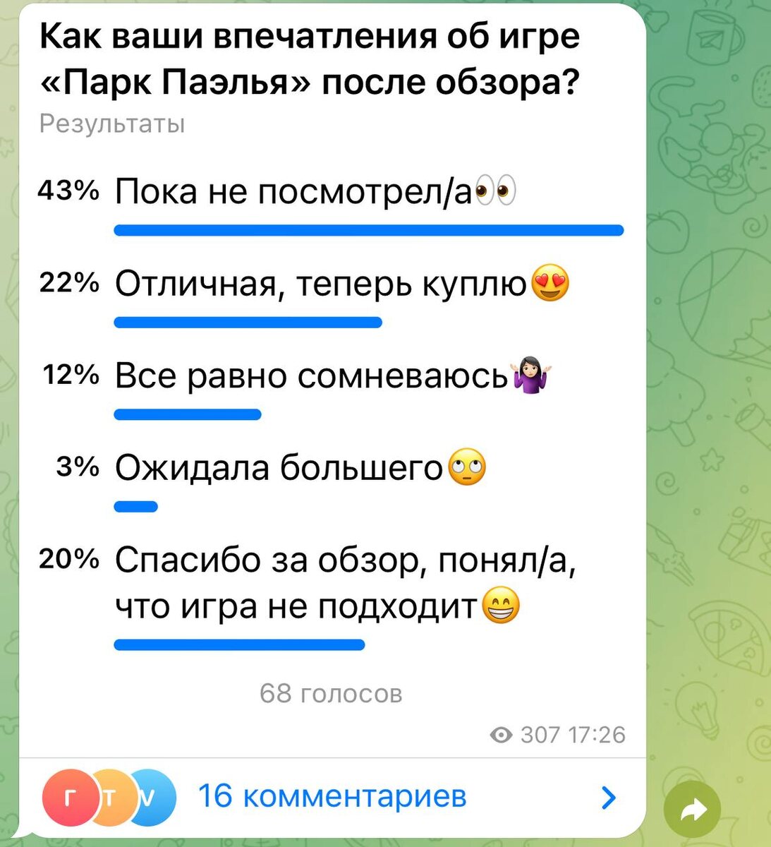 Ух, «Парк Паэлья» - это и открытие, и разочарование в одном флаконе, эмоциональные качели в мире настолок - всё как мы любим😅 Меня радуют две вещи: 1. Количество проголосовавших, кто после обзора решил купить игру, практически такое же, как и тех, кто понял, что игра им не подходит - для меня очень важно не столько побуждать вас к покупке, сколько давать вам представление об игре, чтобы после обзора было больше понимания: зайдет игра или нет. И деньги были потрачены именно на те игры, в которые вы будете играть, а не которые будут пылиться на полке. 2. У нас есть выбор: - выбор НЕ покупать игру, например, игру «Парк Паэлья», не соответствующую нашим эстетическим, этическим и любым другим внутренним ориентирам; - выбор ярких, разноплановых, интересно-оформленных игр, рассчитанных не только на усредненные предпочтения, но и на индивидуальные, как, например, игра «Парк Паэлья»😁 P.S. в карточках не пропустите отзыв Галины, который начинается со слов «Дополню свой отрицательный отзыв…