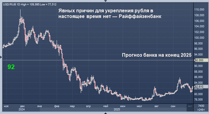 Текущая динамика продаж валюты мало что изменит для курса рубля, а он пока остается избыточно крепким Курс доллара к рублю расчётный, фьючерс, вечный фьючерс и межбанк. Курс евро к рублю расчётный, фьючерс, вечный фьючерс и межбанк. Курс юаня к рублю биржевой, фьючерс, вечный фьючерс и межбанк. Явных причин для укрепления рубля в настоящее время по-прежнему нет, считают аналитики Райффайзенбанка. "Текущая динамика продаж валюты мало что изменит для курса рубля, а он пока, по нашим оценкам, остается избыточно крепким. Впрочем, в последние несколько месяцев российская валюта (пусть и с переменным успехом) сохраняет тренд на ослабление, который в целом выводит ее на уровни, близкие к нашему прогнозу на конец 2025 года (92 руб./$1)", - отмечают эксперты в обзоре. Они по-прежнему полагают, что явных причин для укрепления рубля нет (кроме снижения спроса на валюту по окончании сезона отпусков). "Произошло смягчение денежно-кредитной-политики ЦБ. Нефть существенно просела в цене (сказываются