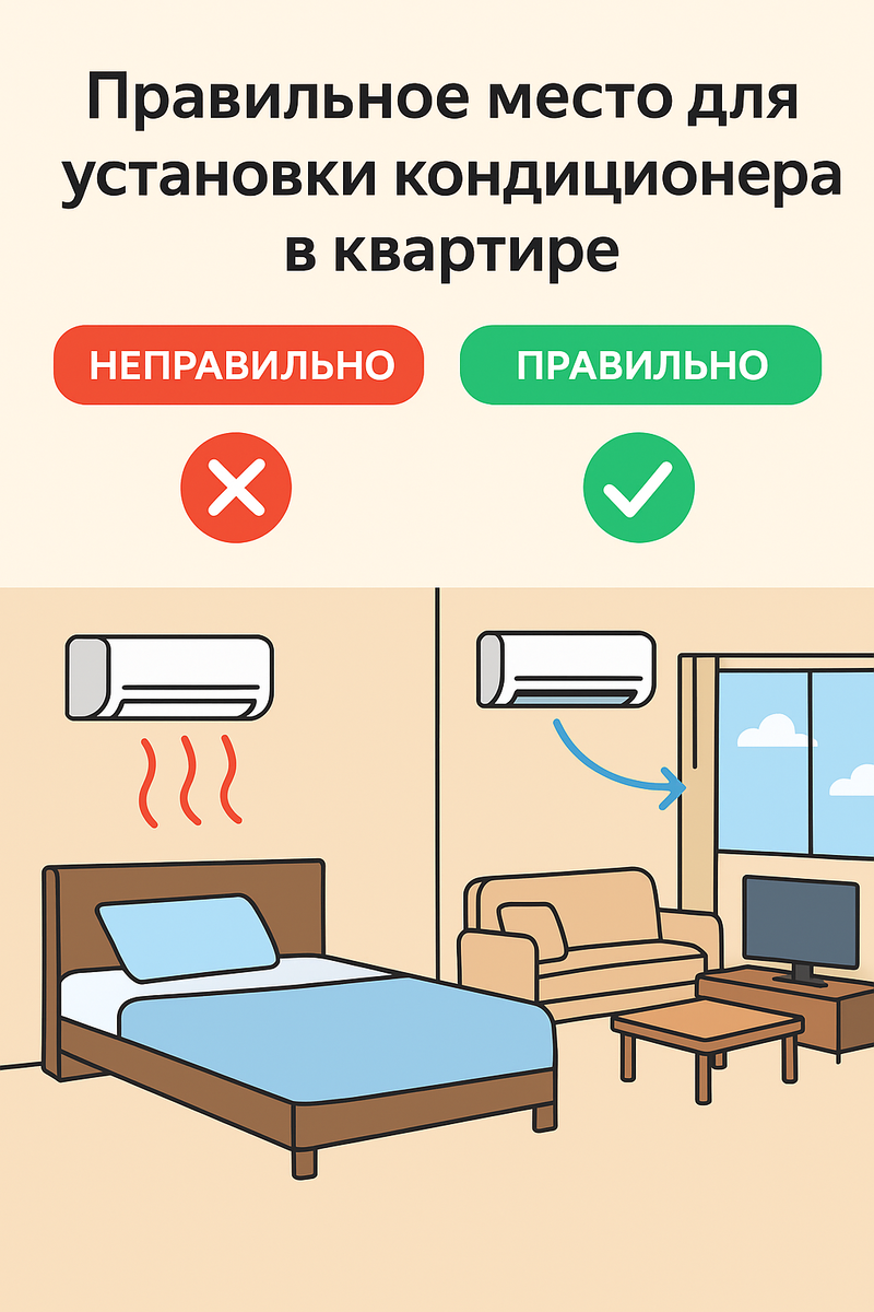Мало просто купить хороший кондиционер — важно установить его в правильном месте. Ошибки при монтаже могут привести к сквознякам, неравномерному охлаждению и даже болезням. Разберёмся, где кондиционер будет работать эффективно и безопасно 👇 Самая частая ошибка — когда кондиционер «дует» прямо на кровать или рабочее место. Результат: простуды, боль в шее и насморк даже летом. ✅ Лучше всего: В спальне кондиционер должен охлаждать воздух вокруг, а не вас. Идеально — установить блок сбоку от кровати, чтобы холодный поток шёл вдоль стены или в центр комнаты. 💡 Советы: Если комната просторная, важно обеспечить равномерное распределение воздуха. Лучше установить кондиционер на стене напротив окна, чтобы потоки воздуха смешивались с естественным движением тепла от солнца. 💡 Если есть телевизор — ставьте кондиционер в стороне от экрана, чтобы не мешал обзору и не перегревался. На кухне много тепла от плиты и духовки, поэтому кондиционер должен стоять подальше от источников тепла. Идеальное