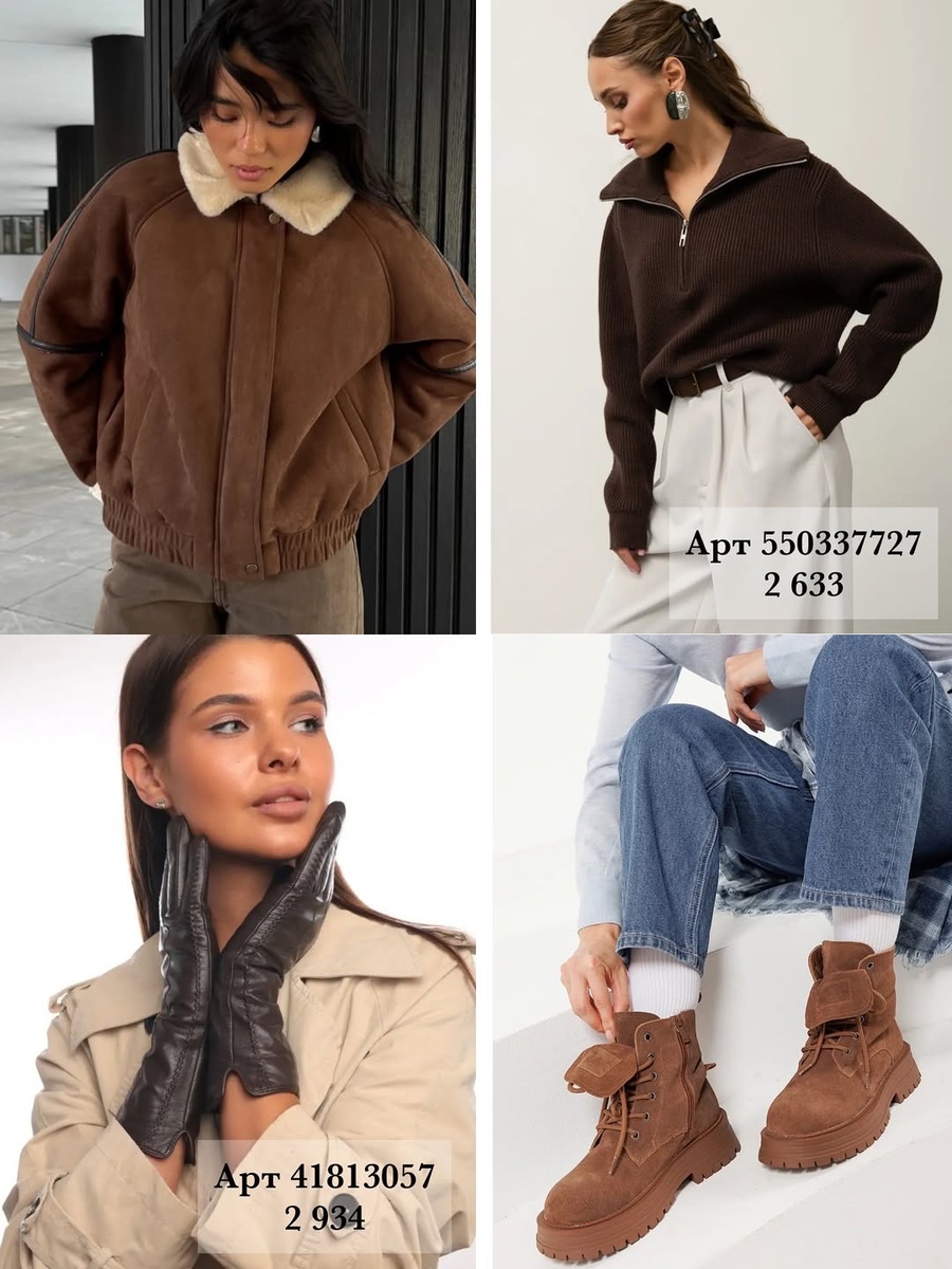 Зима — время тактильных удовольствий: плотный трикотаж, мягкий мех, кожа и замша. В этой подборке — вещи с ВБ, из которых легко сложить и городской повседневный образ, и уютный выходной. Идём строго по порядку с артикулами, разбираем детали и даю советы стилиста, как носить и сочетать. арт. 550337727 Глубокий шоколадный оттенок, выразительная резинка и воротник с короткой молнией. Посадка свободная, плечо слегка спущено, рукава объёмные — это даёт ту самую «дорогую» небрежность. Трикотаж держит форму, но остаётся пластичным, красиво драпируется при полузаправке в пояс. Как носить Акцент стилиста. Расстегните молнию на пару сантиметров и наденьте крупные серьги-кольца — линия шеи станет изящнее, а свитер зазвучит вечернее. арт. 41813057 Классические тёмно-шоколадные перчатки из мягкой кожи с шелковистым блеском. Длина закрывает запястье и частично предплечье — это удобно с пальто и тренчем: ветер не проходит к рукавам. Крой анатомический, швы тонкие, ладонь садится аккуратно, без «гар