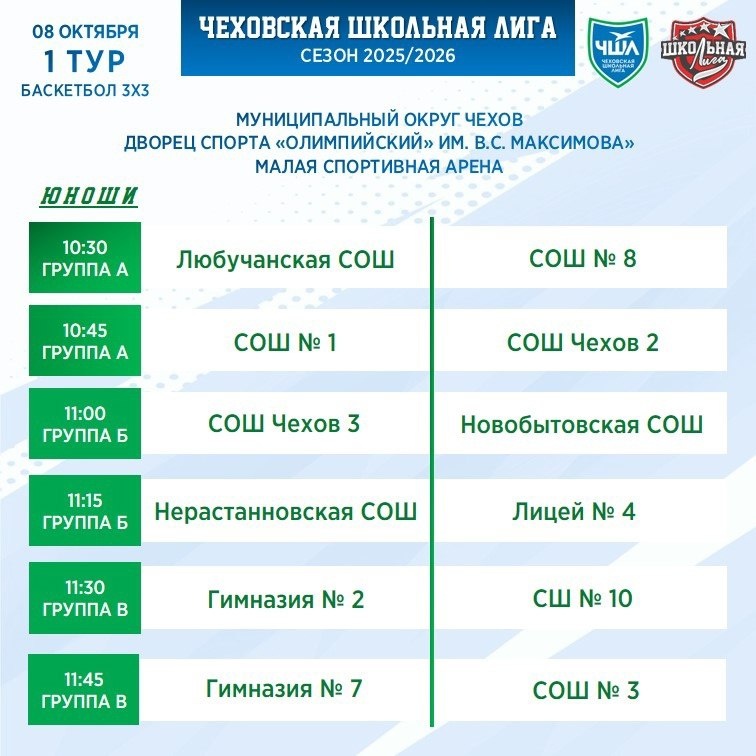 ✨ 🏀 РАСПИСАНИЕ | БАСКЕТБОЛ 3х3 🏀 8 октября на малой спортивной арене ДС «Олимпийский» им. В.С. Максимова» состоятся первые встречи команд ЧШЛ! 🤩 Юноши и девушки будут играть в баскетбол 3х3 📍 Адрес: г. Чехов, ул. Полиграфистов, стр. 30 ❗️НАЧАЛО ИГР в 10:30 Поделись постом со своей командой!😉 🏢 Дворец спорта Олимпийский имени В.С. Максимова 📍 г. Чехов, ул. Полиграфистов, стр.30 ⭐Разместить публикацию ⭐Поддержать голосом ✅ Спортивный Чехов https://dzen.ru/id/66f02564335c7475d84fbf87 http://vk.com/chehov_sport http://dzen.ru/chehov_sport