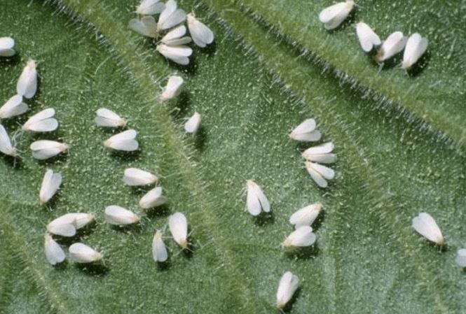 Мелкая, белая, почти незаметная мошка поселяется на нижней стороне листьев.
