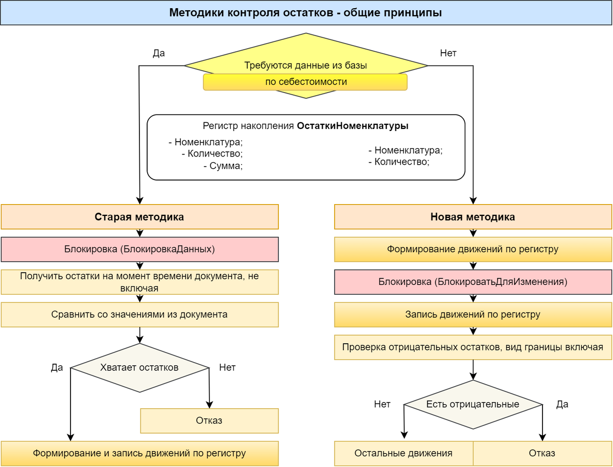 При решении задач оперативного и бухгалтерского учета для контроля отрицательных остатков существуют две методики "старая" и "новая".