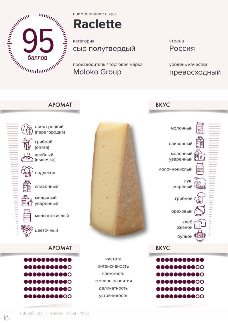 Какой сыр выбрать для горячих блюд? Пасты, супы, ризотто, фондю и другие горячие блюда, которые так полюбились нам всем. Как найти идеальный сыр, который не испортит, а дополнит вкус горячего блюда. Если внимательно изучить журнал "Сырный гид", то можно найти массу образцов, которые идеально дополнят ваше горячее блюдо. Отличный образец раклета – внешне, по ароматическому и вкусовому профилям, послевкусию. У сыра отличный баланс во вкусе и нежная консистенция, особенно ближе к центральной части. Хороший вариант для украшения сырной тарелки, а также для дополнения горячих блюд - пасты, запеканки, супы. Сыр оставляет очень хорошее впечатление, интересный ароматический и вкусовой профили, несмотря на доминирование клубники, она не затмевает сырную основу. Сыр с хорошим длительным послевкусием. Варианты употребления – самостоятельно, в салатах, десертах, а также в горячих блюдах - ризотто, паста или фондю. Сыр с хорошим балансом во вкусе, при яркой молочнокислой ноте она не выпирает, хо