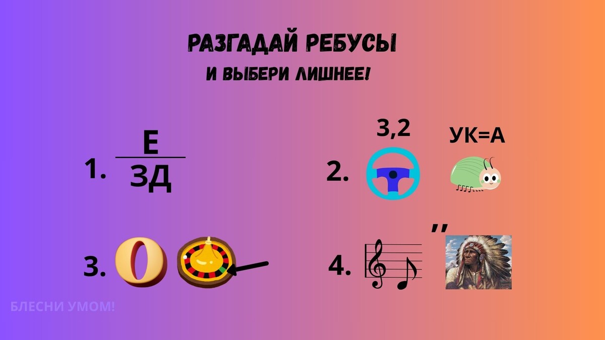Любите ребусы? Тогда это задание для вас. 🔍 Интересный факт о ребусах: Слово «ребус» происходит от латинского выражения "non verbis, sed rebus", что означает «не словами, а вещами». Это отражает суть ребуса — передача смысла через изображения, символы и буквы, а не прямой текст. 🎨 В Средние века ребусы использовались не только как развлечения, но и как способ тайной переписки. Например, французские аристократы шифровали послания с помощью картинок, чтобы скрыть смысл от посторонних глаз. Перед вами 4 зашифрованных слова, одно из которых не имеет ничего общего с остальными. Разгадайте слова и найдите лишнее! ✍Пишите ваши варианты в комментариях! Подписка и лайк приветствуются🤗 Ещё больше ребусов ищи здесь!