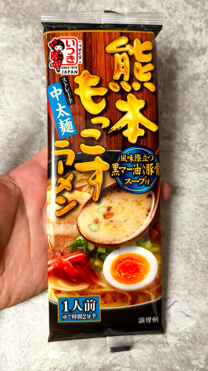 Пробую японскую лапшу со свиным бульоном с чесноком.