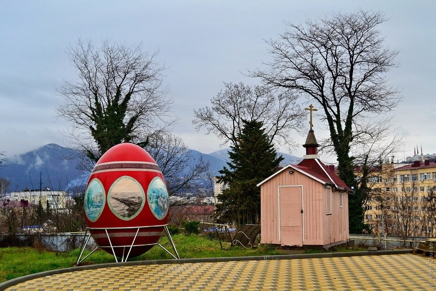 Огромное пасхальное яйцо, расписанное видами города.