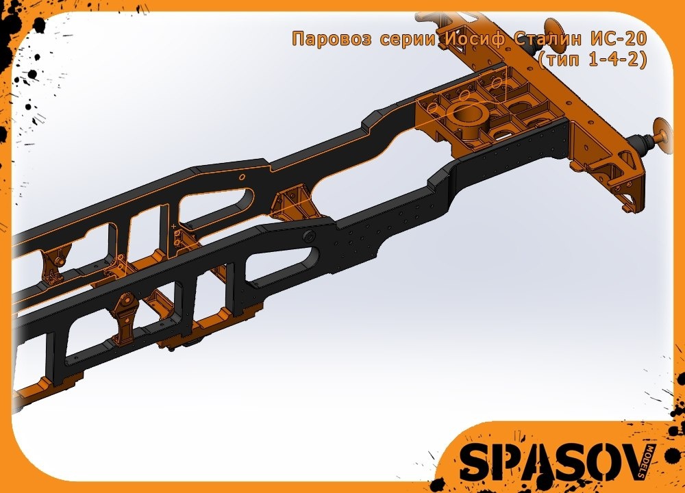 SpAsov из Георгиевска Ставропольского края проектирует для выпуска на 3D-принтере в масштабе 1/35 модель паровоза серии Иосиф Сталин ИС-20 (тип 1-4-2). Показаны рендеры рамы.